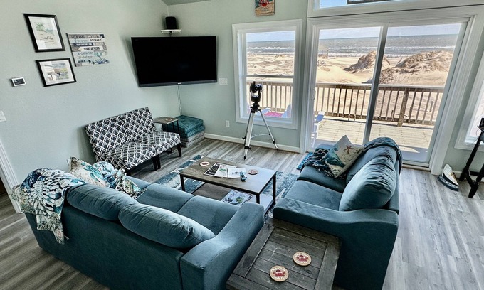 Sandy Claws caters specifically to families and offers a scavenger hunt for young children. Additional on-site activities include three smart TVs (living room, King Beach, and gaming alcove), numerous puzzles and games, books, a sand box, a seven-person hot tub, plastic Adirondack and traditional beach chairs and a wagon, a fire pit with eight chairs, tether ball, corn hole, and many more outdoor and indoor games.