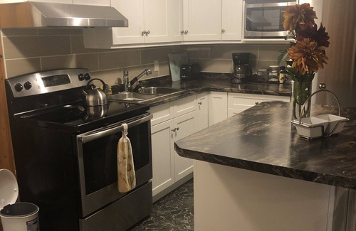 Cozy, beautiful one bedroom queen size bed, lower level apartment and double Murphy bed in the living area. Enjoy the cozy gas fireplace. Fully stocked kitchen. Monthly and weekly discount. Complimentary Coffee, tea, oatmeal, cereals, crousants, jam, peanut butter and milk provided to start off your stay. Touletries , provided and hair dryer. Laundry-washer and dryer across the hall directly in front of your apartment included with soap etc. The beautiful backyard backs onto a creek which is beautifully landscaped, including a large patio and swimming pool in the summer months with a fire pit. The yard has lights in the trees with beautiful gardens, nighttime reveals the beauty of the extensive solar lighting that abounds throughout the property. This yard was featured in the 2022 garden tour and seen as one of the most beautiful gardens by the guests. The gardens were also used for a local clothing artist for a photo shoot. This property is close to the cascades, boulevard lake, centennial Park and there are close biking and walking trails. There is a bus stop across the street, the expressway is close and the downtown core is within 5 min by vehicle. Owner on sight to ensure availabilty if needed, toiletries are available and cleaning products to spot clean should you choose.