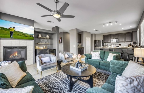 This vacation home opens to a spacious living room with a family kitchen. There is plenty of room in the living room to lounge in front of a 65-inch Hisense Smart television and natural gas fireplace with comfort. Stay cool under the remote-controlled ceiling fan. Featuring a soft velvet couch and chairs, this space is perfect for lounging while watching your favorite shows. Next to the living room fireplace, the bar area is a fully equipped mixology space, boasting a wine and beverage chiller with a bar shaker set. Perfect for practicing your cocktail crafting skills, this space adds a touch of sophistication to your stay. Next to the living area, fitness enthusiasts will find an exercise bicycle to help maintain their workout routine. The casual dining room features a dining table with seating for 8, illuminated by a stylish chandelier that sets a warm ambiance. The fully-equipped kitchen features stunning stainless steel appliances, such as a side-by-side refrigerator with a water and ice dispenser. It offers everything one would need to create their perfect meal, including granite countertops and bar-height dining with seating for 4. No spices, condiments, or oils are provided.